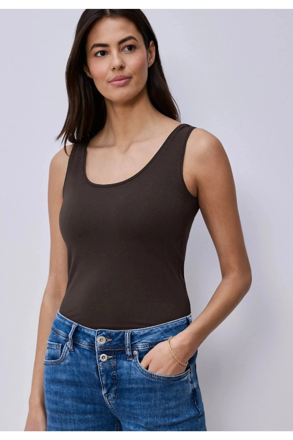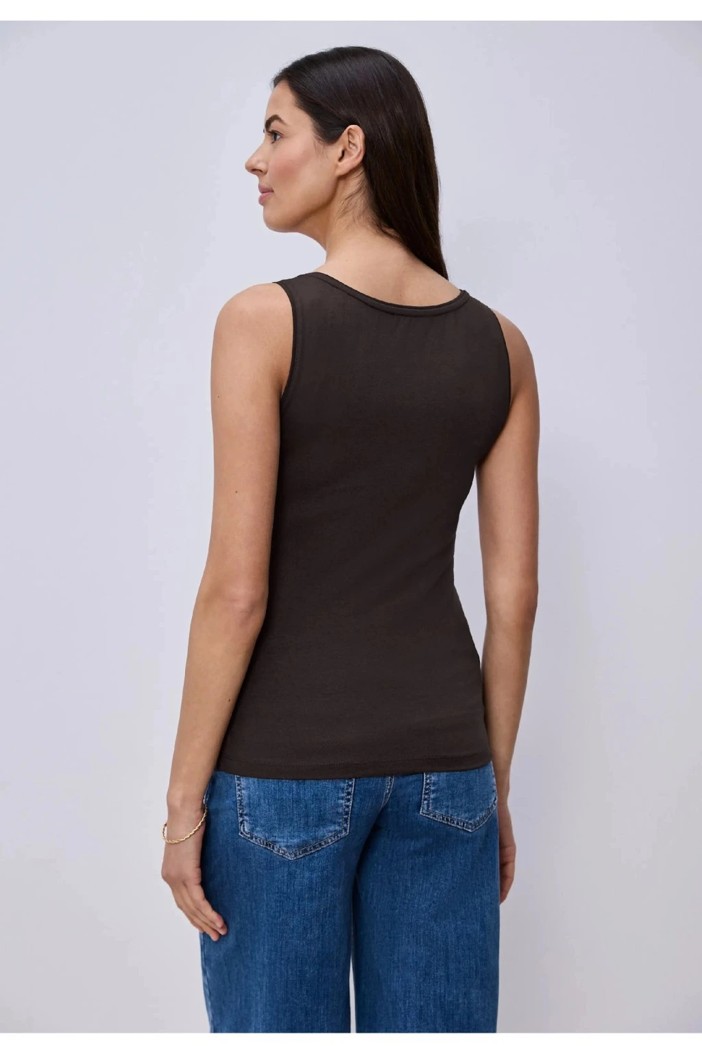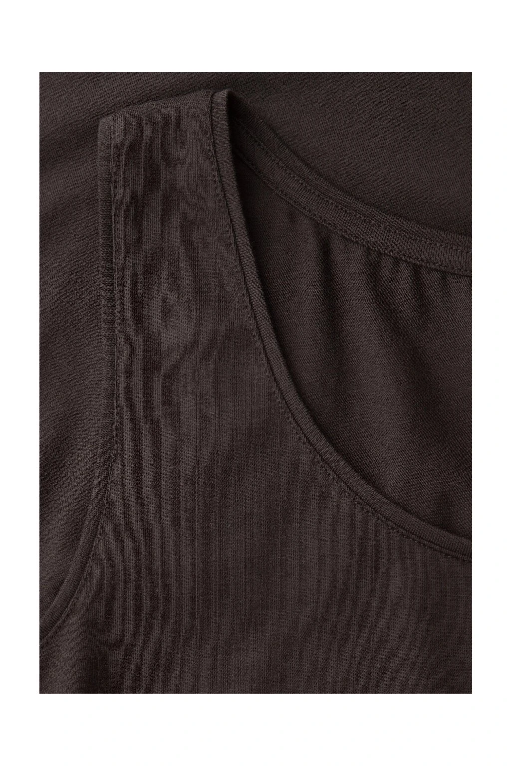 Jednoduché dámske tielko v nadčasovej tmavo hnedej farbe je základným kúskom každého šatníka. Príjemný, elastický materiál sa skvele prispôsobí postave a zaistí maximálne pohodlie pri nosení. Minimalistický strih umožňuje ľahké kombinovanie - perfektne sa hodí k džínsom, sukniam aj pod sako či sveter. Ideálna voľba pre každodenný outfit aj vrstvenie počas celého roka.