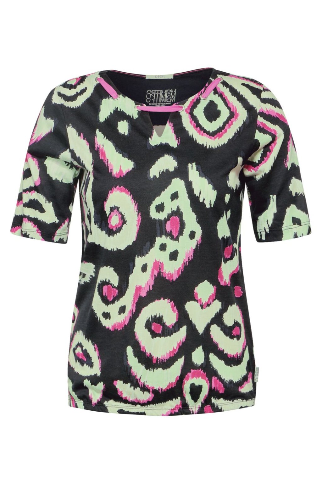 Ležérne, moderné tričko pre ženy CECIL je trendy tričko s krátkym rukávom a pútavou potlačou a rázporkom pre atraktívny vzhľad. Elastický pás zaisťuje pohodlné nosenie, zatiaľ čo detail šnúrky pri výstrihu dodáva triku hravý nádych. Toto tričko vyrobené z vysoko kvalitného bavlneného modalového džerseja ponúka nielen módny vzhľad, ale aj pohodlný pocit pre každodenné nosenie.
