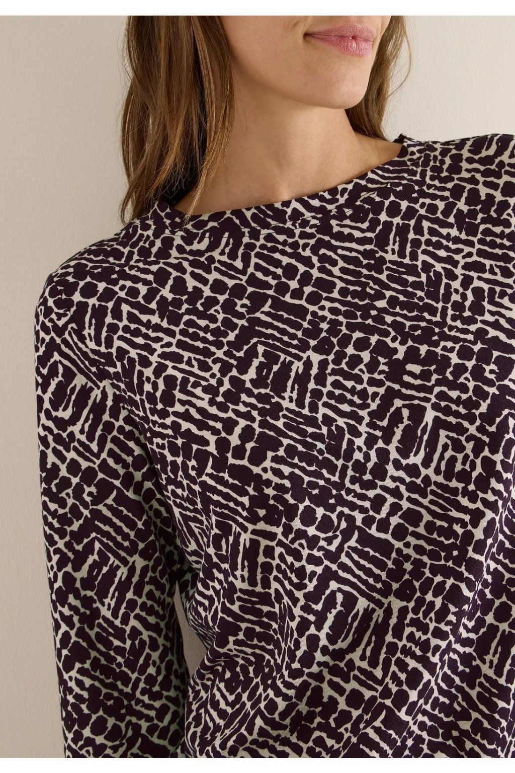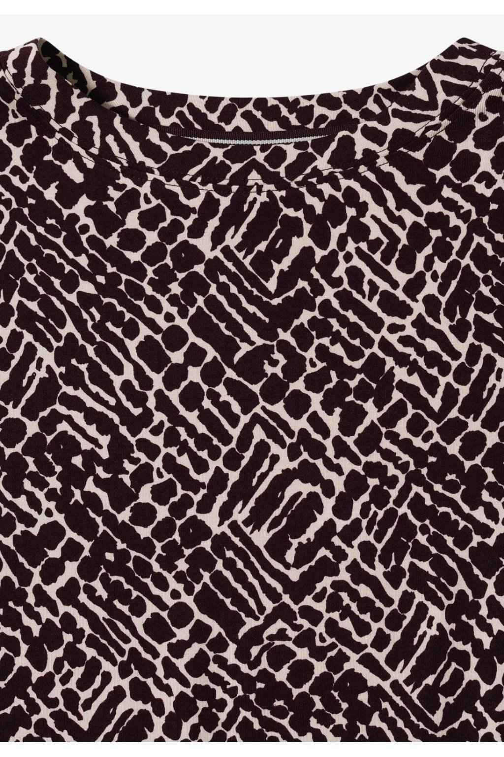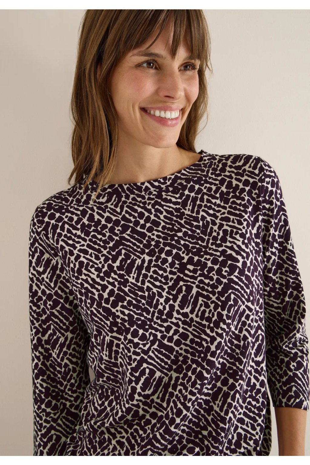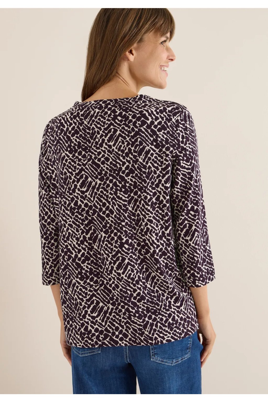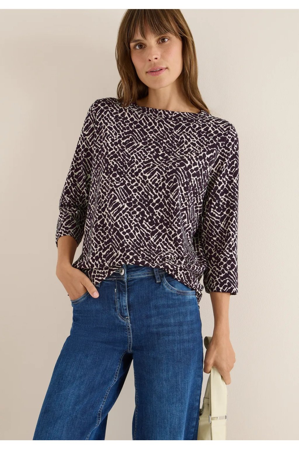 Táto dámska blúzka od značky CECIL zaujme svojou minimalistickou grafickou potlačou a ženským lodičkovým výstrihom. Mäkká zmes bavlny a modalu s pridanou strečovou úpravou zaisťuje pohodlný pocit, zatiaľ čo trojštvrťové rukávy a bočné rázporky dodávajú vzhľadu ležérny nádych. Ideálne pre štýlové každodenné outfity.