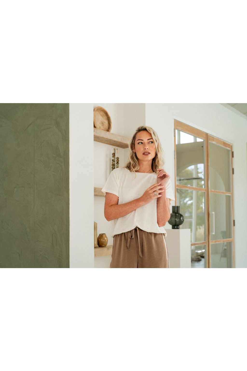 Elegantné dámske tričko s perličkami je ideálnou voľbou pre ženy, ktoré chcú spojiť pohodlie s jemnou eleganciou. Je vyrobené z príjemného bavlneno-modalového materiálu, ktorý je hebký na dotyk a skvele sa nosí po celý deň. Má okrúhly výstrih, moderné spadnuté rukávy a pružný spodný lem, vďaka ktorému krásne držia tvar. Prednú časť zdobia decentné perličky v rôznych veľkostiach, ktoré dodávajú outfitu ženský a sofistikovaný nádych. Perfektný k džínsom aj elegantnejším kúskom.