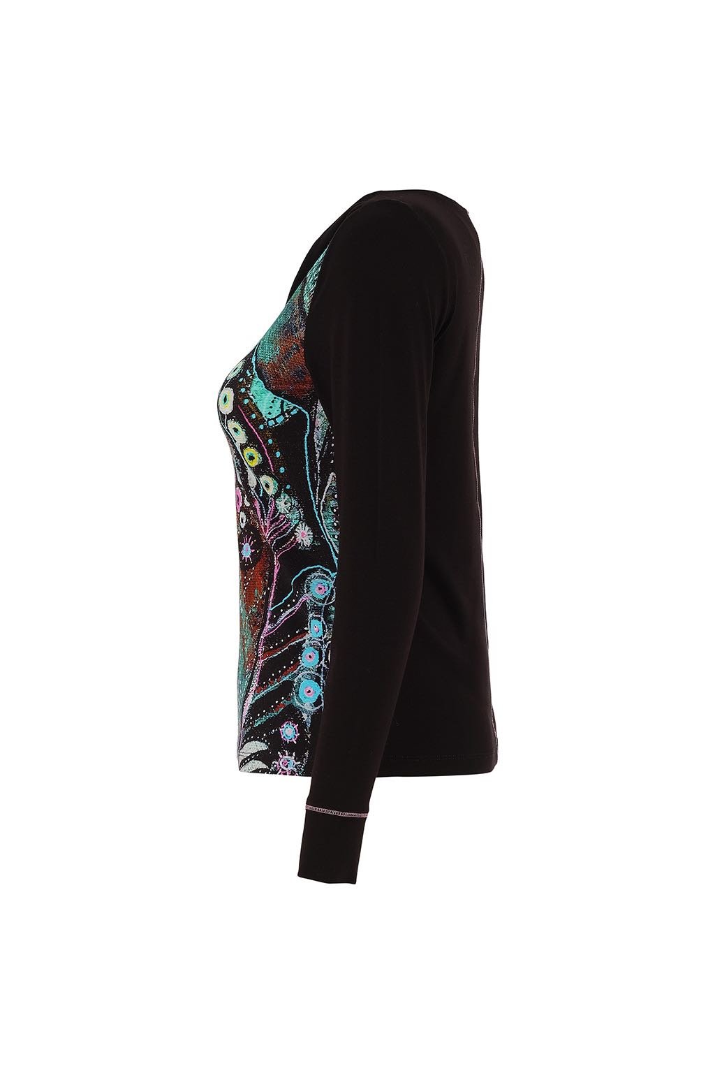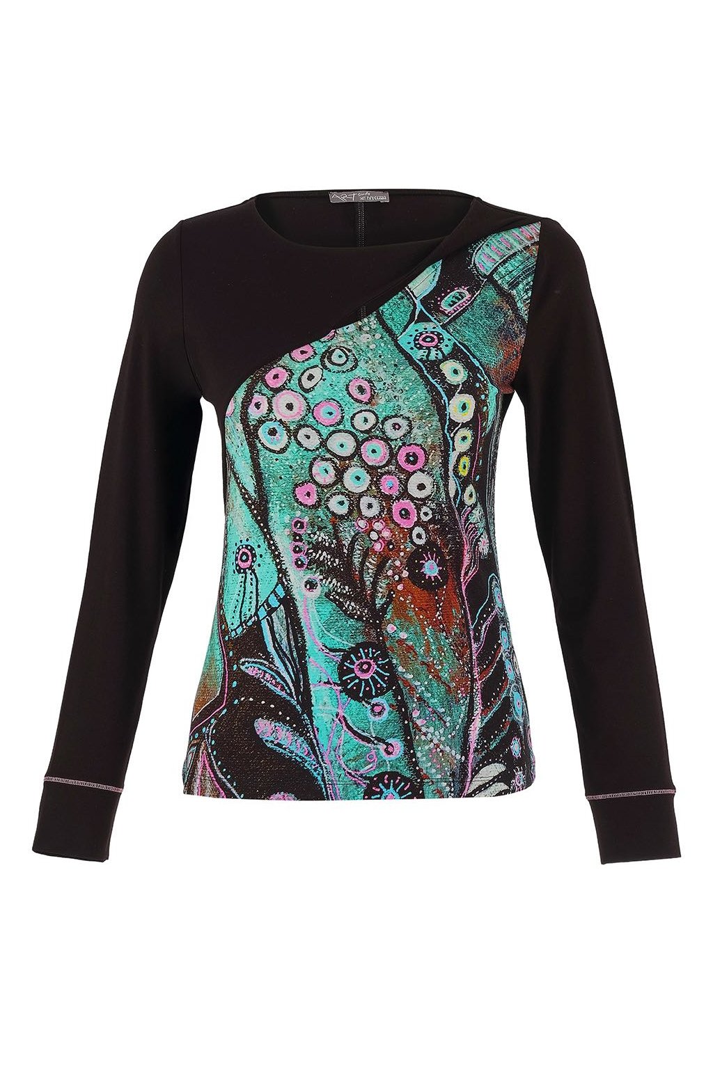 Originálny úpletový top v asymetrickom strihu s dekoratívnym zavinutím látky pri výstrihu a kontrastným prešívaním. Motív je inšpirovaný umeleckým dielom Laurie DeVault (California, USA) vo farebnej palete tyrkysovo zelenej, čiernej a ružovej. Ľahký pružný materiál a pohodlný strih lichotí postave a zaistí celodenný komfort. Dlhé rukávy z neho robia ideálnu voľbu na prechodné obdobie. Pre dokonalý outfit ho môžete skombinovať s čiernymi nohavicami z rovnakej kolekcie.