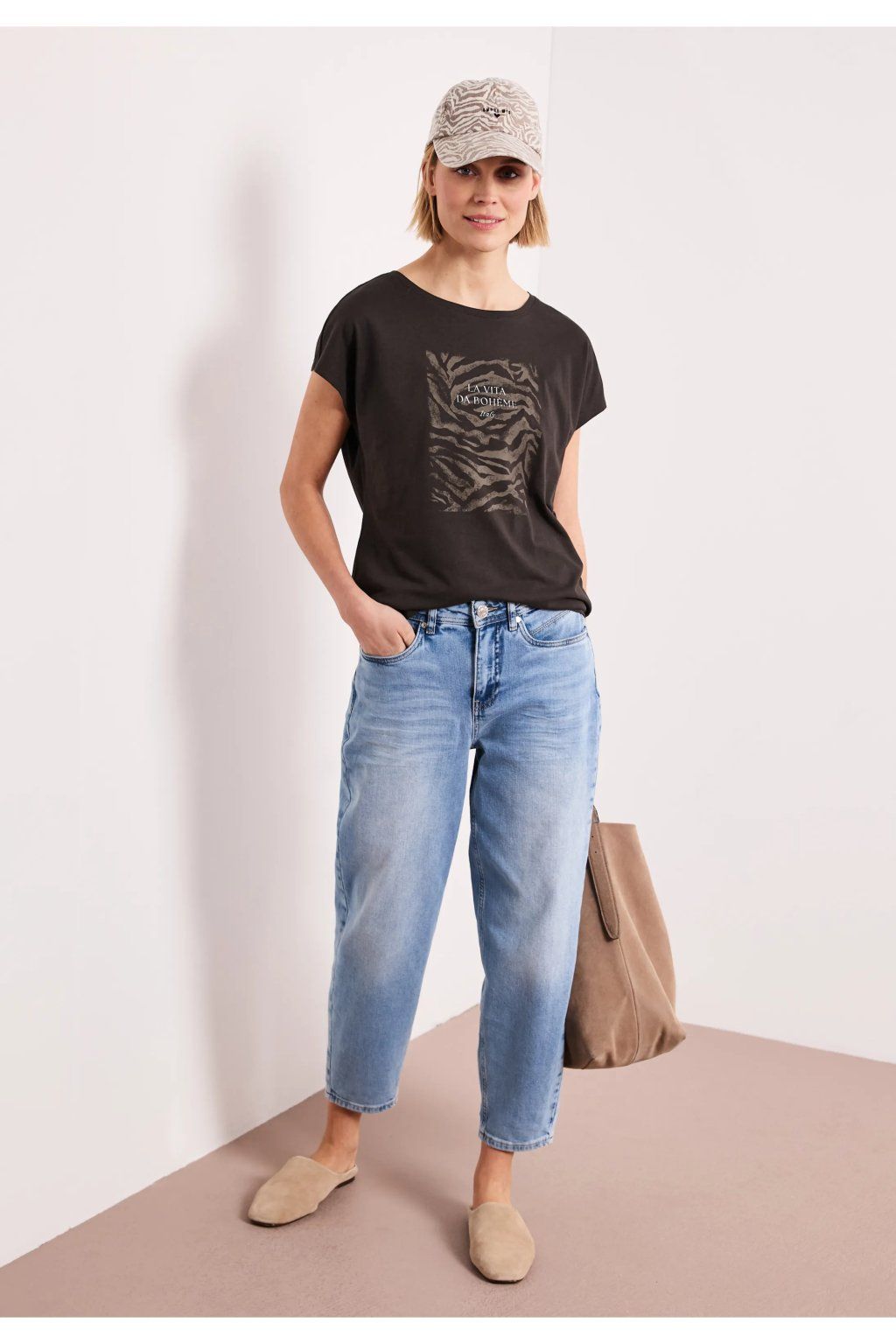 Štýlové dámske tričko v tmavom prevedení zaujme na prvý pohľad modernou potlačou s jemným zebrím motívom a nápisom „La Vita da Bohème“. Má pohodlný, ľahko voľnejší strih s krátkym rukávom a okrúhlym výstrihom, vďaka ktorému sa skvele nosia po celý deň. Ideálna k džínsom aj ležérnym outfitom – jednoduchý kúsok, ktorý dodá štýl bez námahy.