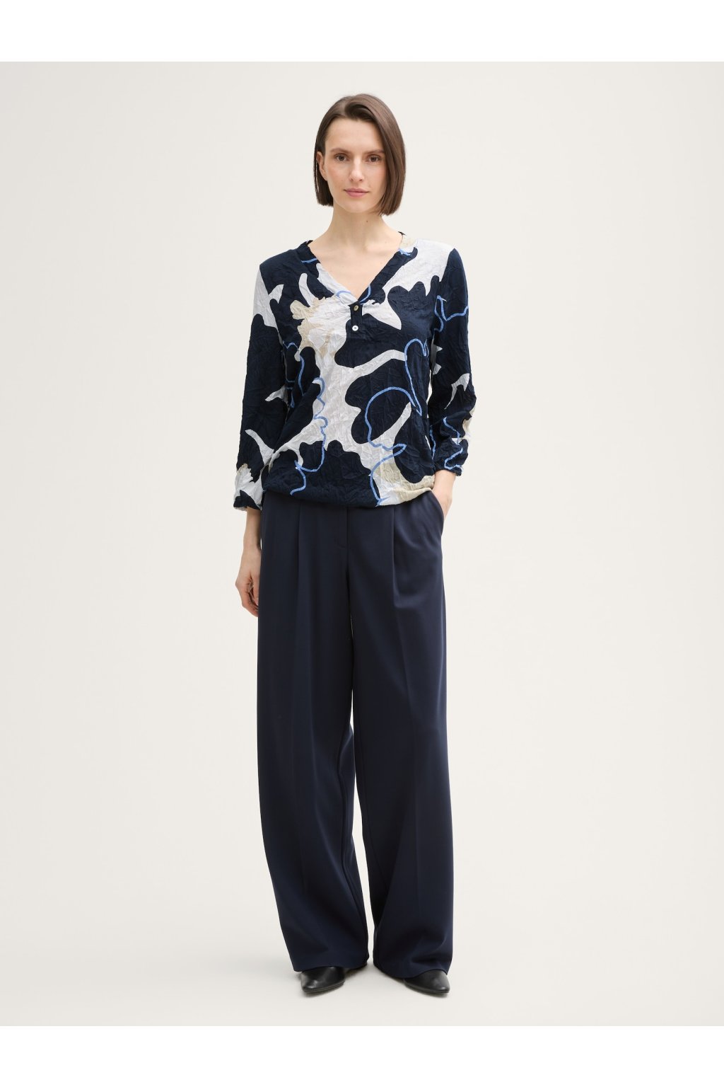 Dámske vzorované tričko s trojštvrťovými rukávmi a výstrihom do V je štýlový a pohodlný kúsok na každý deň. Ľahký a priedušný materiál zaistí komfortné nosenie, zatiaľ čo elegantný výstrih do V opticky predĺži postavu. Trojštvrťové rukávy pôsobia nadčasovo a hodia sa na každú sezónu. Vďaka originálnemu vzoru tričko ľahko oživí váš outfit a skvele sa kombinuje s džínsami, sukňou aj elegantnými nohavicami.