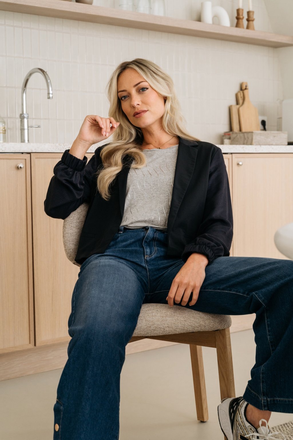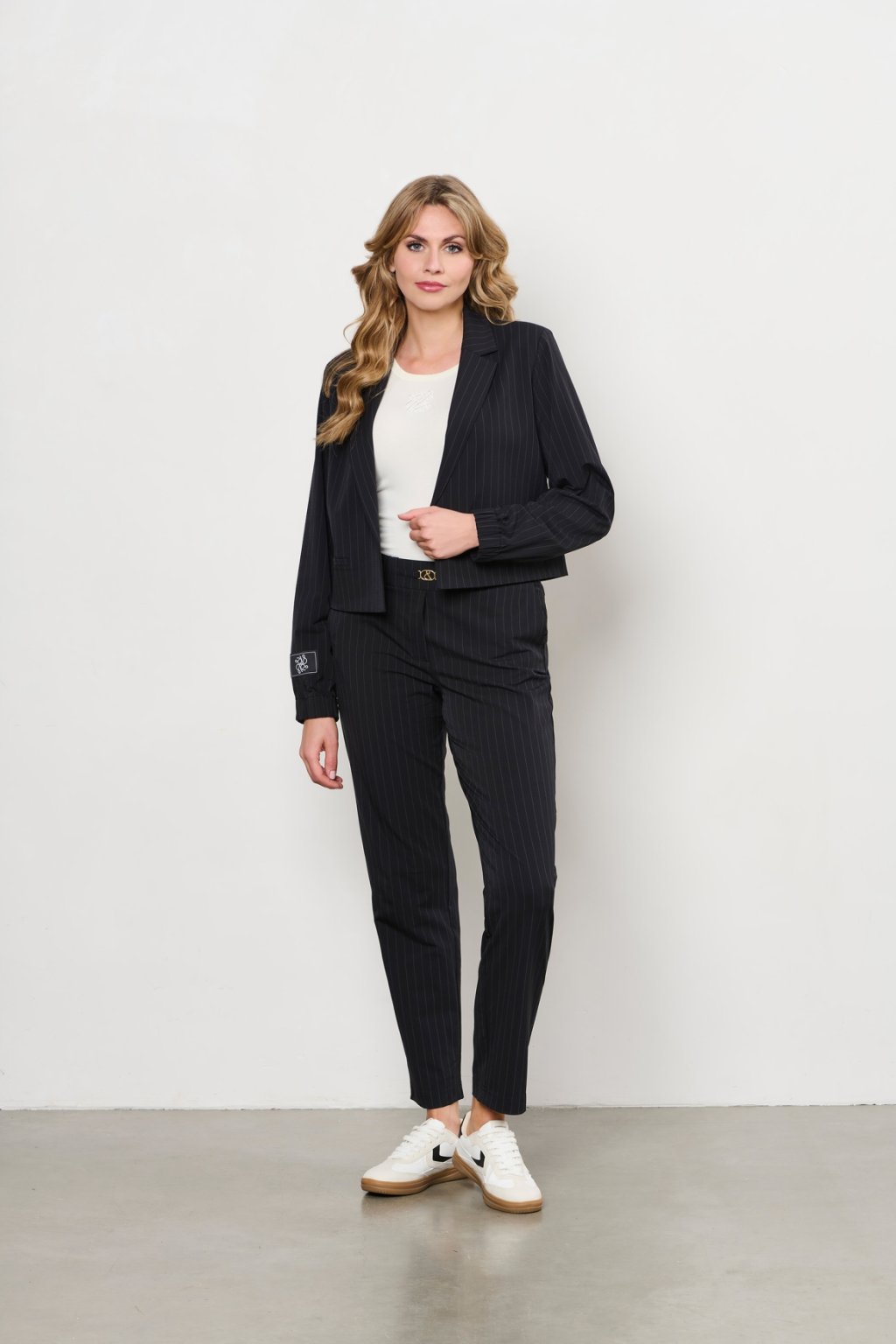 Tento elegantný blejzer je vyrobený z praktického travel quality materiálu s decentným prúžkom, ktorý je pohodlný, nekrčí sa a skvele drží tvar. Má klasický golier s chlopňami, predné lištové vrecko a dlhé rukávy zakončené pružnou gumou v manžetách, čo mu dodáva moderný a ležérny nádych. Vďaka neštruktúrovanému strihu bez podšívky je ľahký a ideálny ako do práce, tak aj na cestovanie alebo voľnočasové nosenie.