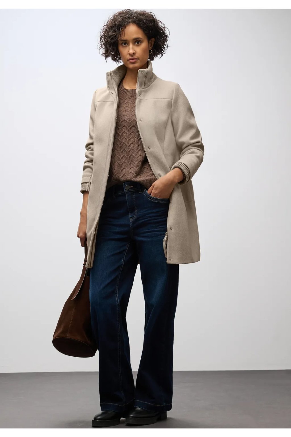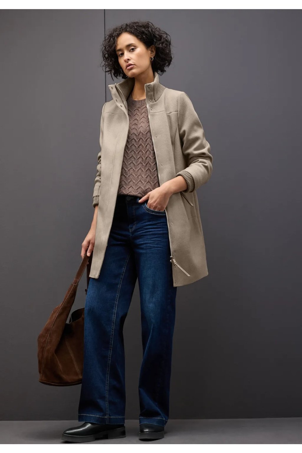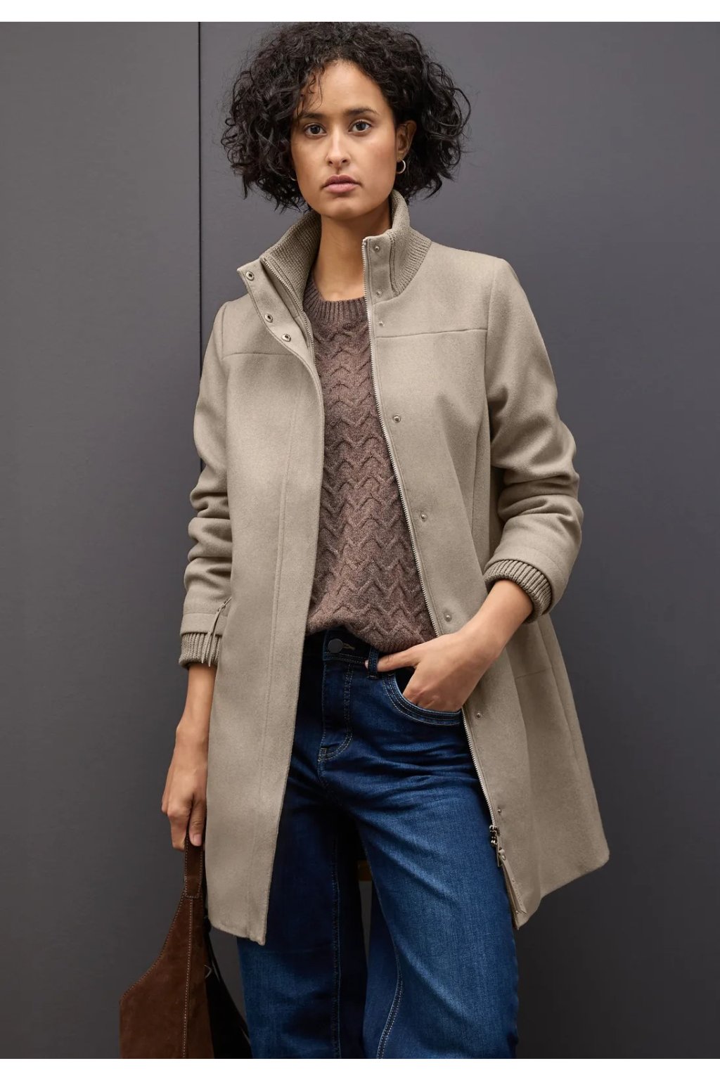Tento dámsky kabát od Street One kombinuje klasickú eleganciu s modernými detailmi. Pletené prvky na stojačiku dodávajú kabátu štýlový nádych, zatiaľ čo materiál s vlneným vzhľadom mu dodáva vysoko kvalitný vzhľad. Bočné vrecká na zips a zapínanie na gombíky po celej dĺžke z neho robia perfektného spoločníka pre prechodné ročné obdobia.