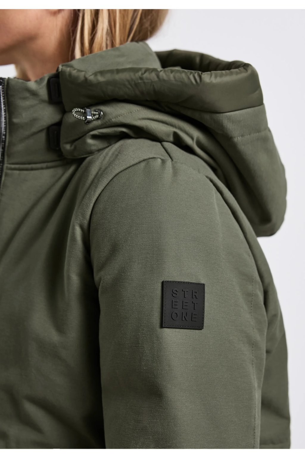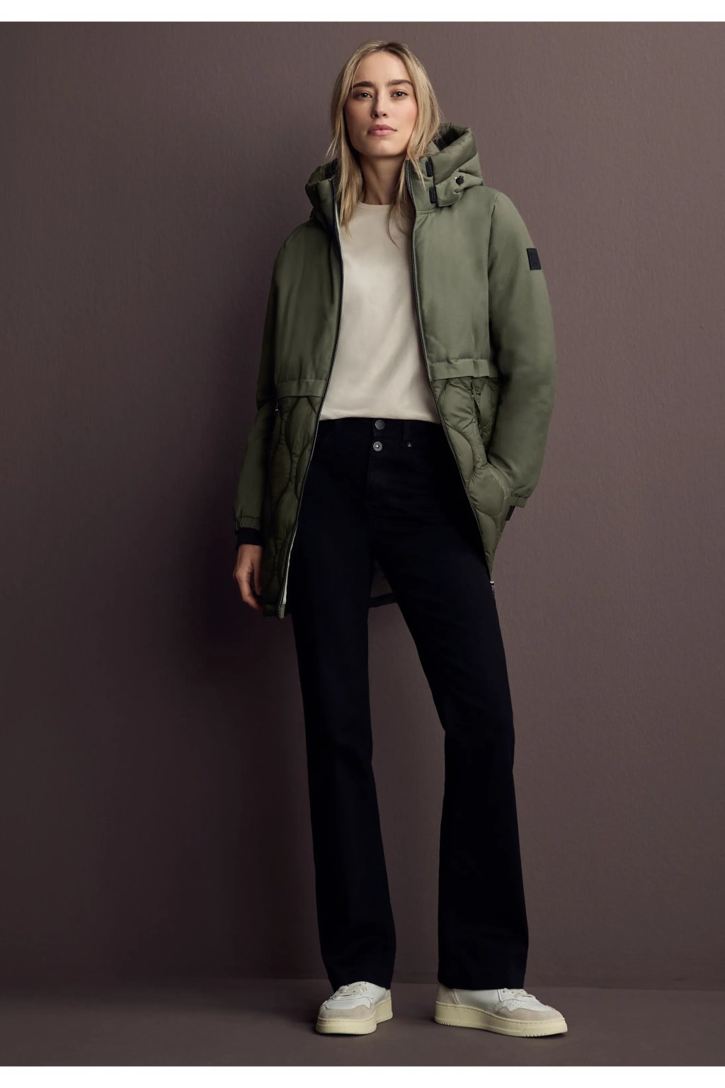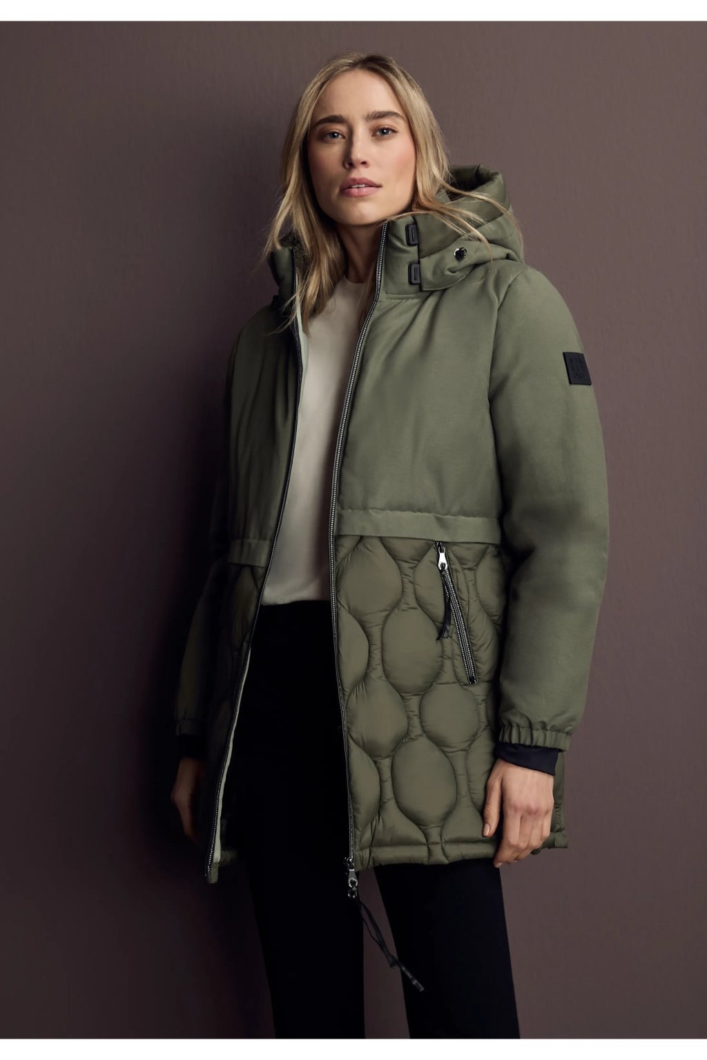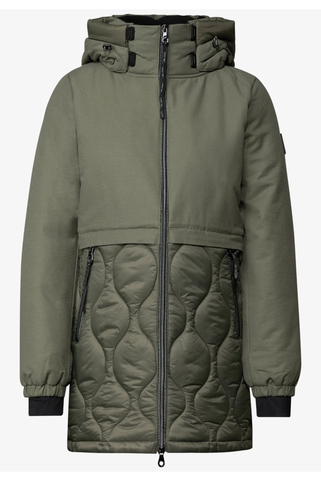 Tento dámsky kabát Street One s textúrovaným mixom kombinuje vrchnú časť zo softshellového materiálu s teplou prešívanou podšívkou. Kapucňa so sťahovacou šnúrkou poskytuje dodatočnú ochranu a vrecká na zips zaisťujú funkčnosť. Štýlová prechodná bunda s atraktívnym kontrastom materiálov a výnimočným pohodlím.