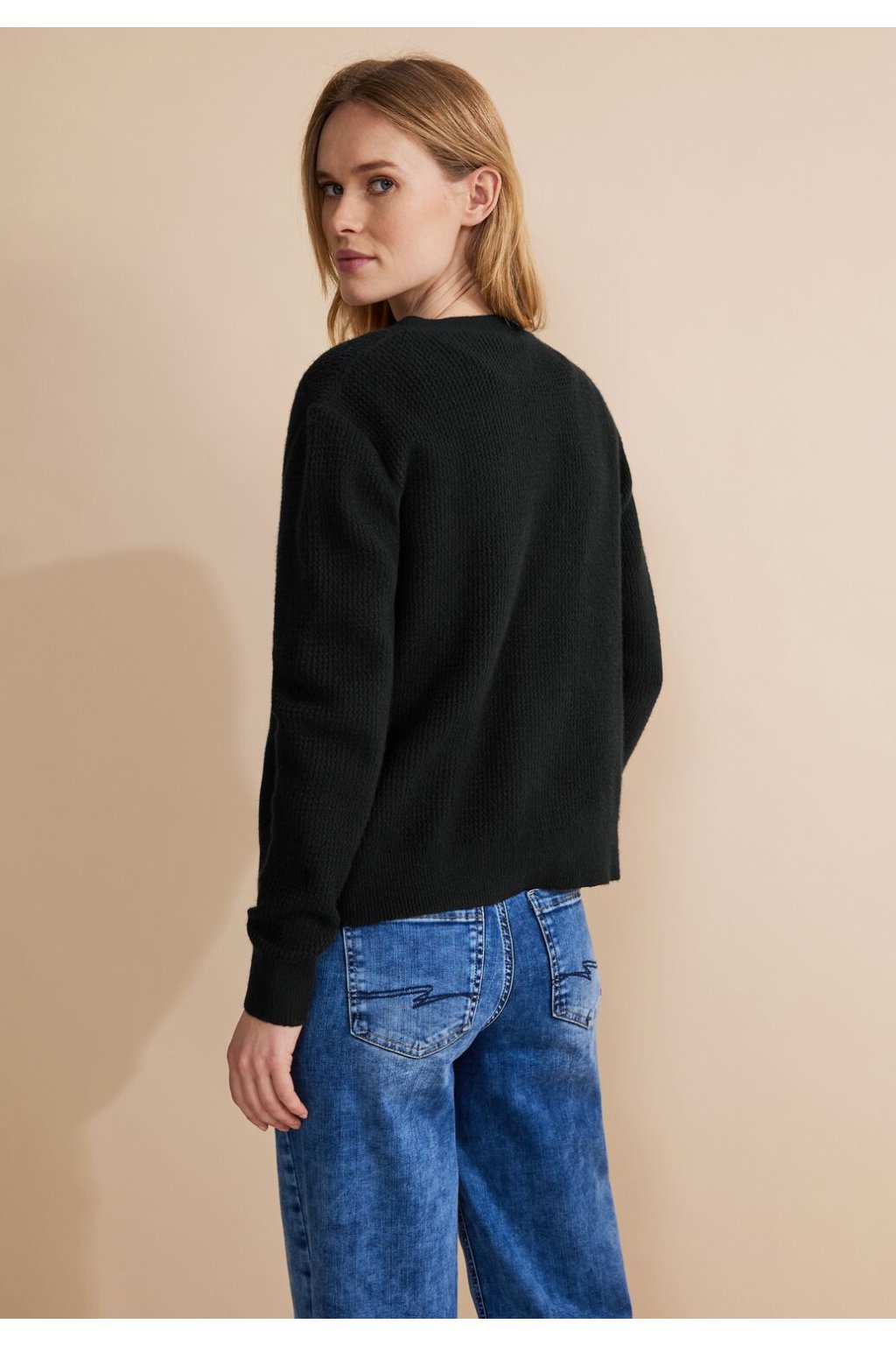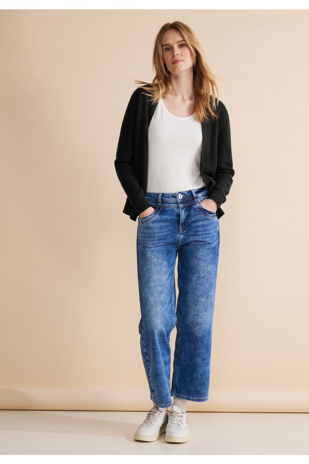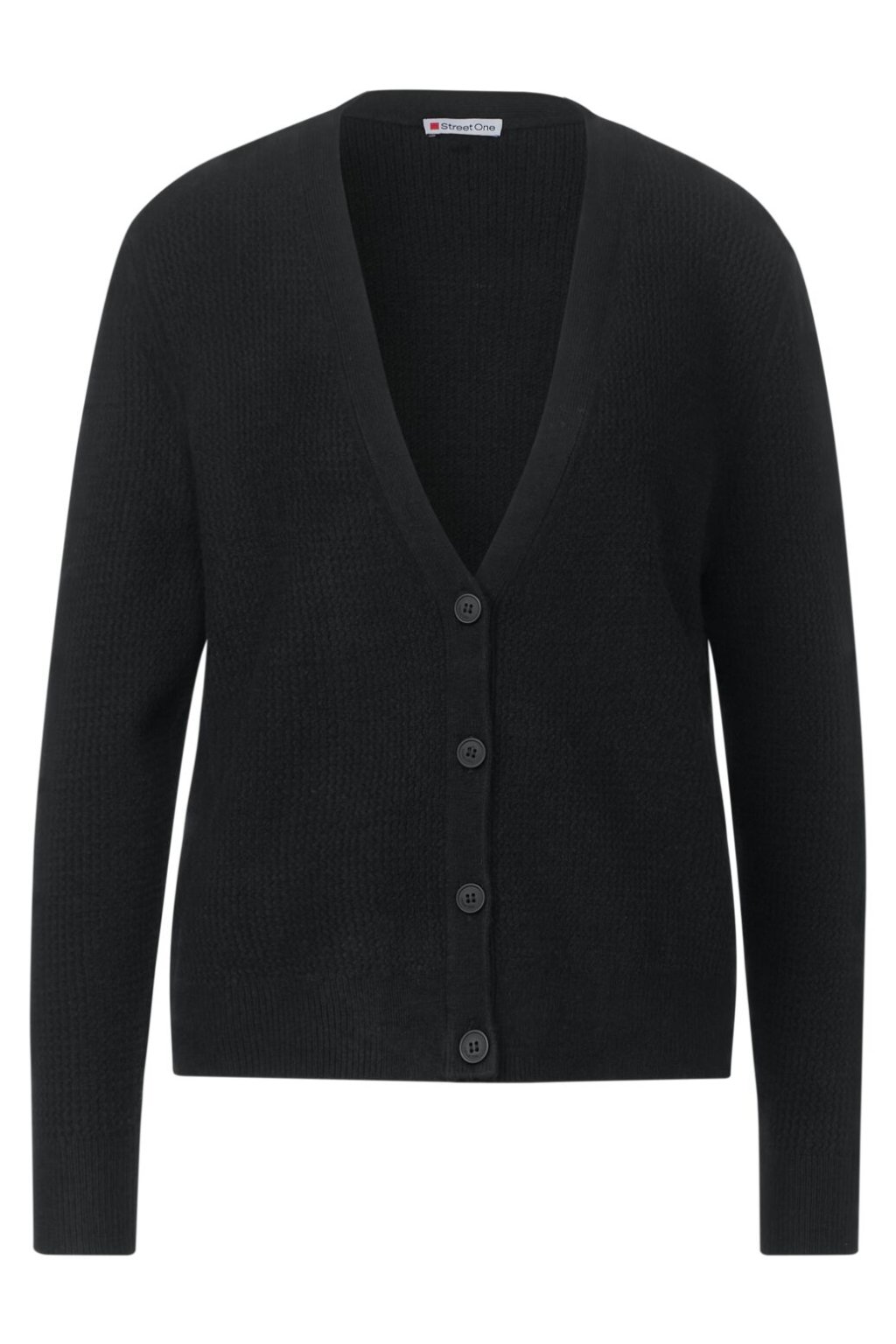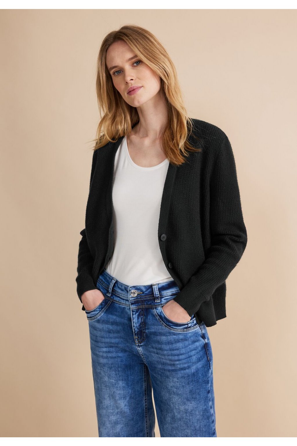 Dámsky kardigan od Street One z robustného úpletu zaujme výstrihom do V a gombíkovou légou. Vyznačuje sa rebrovaným vzhľadom a mäkký materiálový mix zaisťuje pohodlné nosenie. Tento kardigán je pohodlným spoločníkom s mnohými možnými kombináciami.