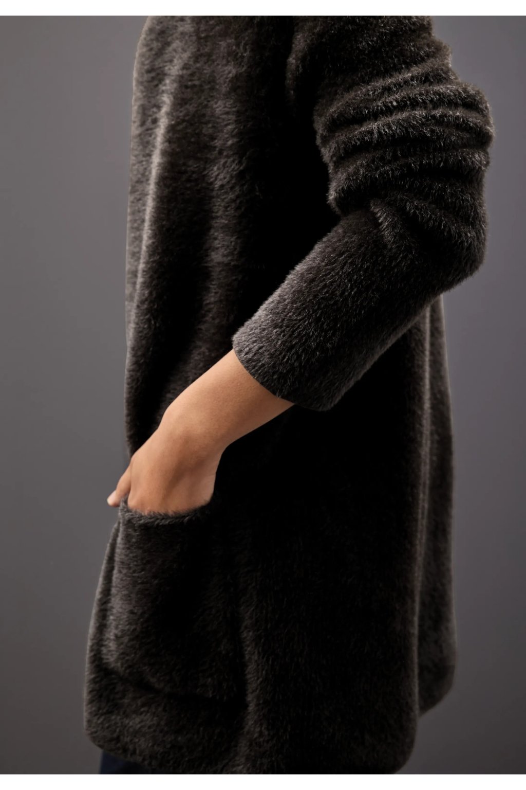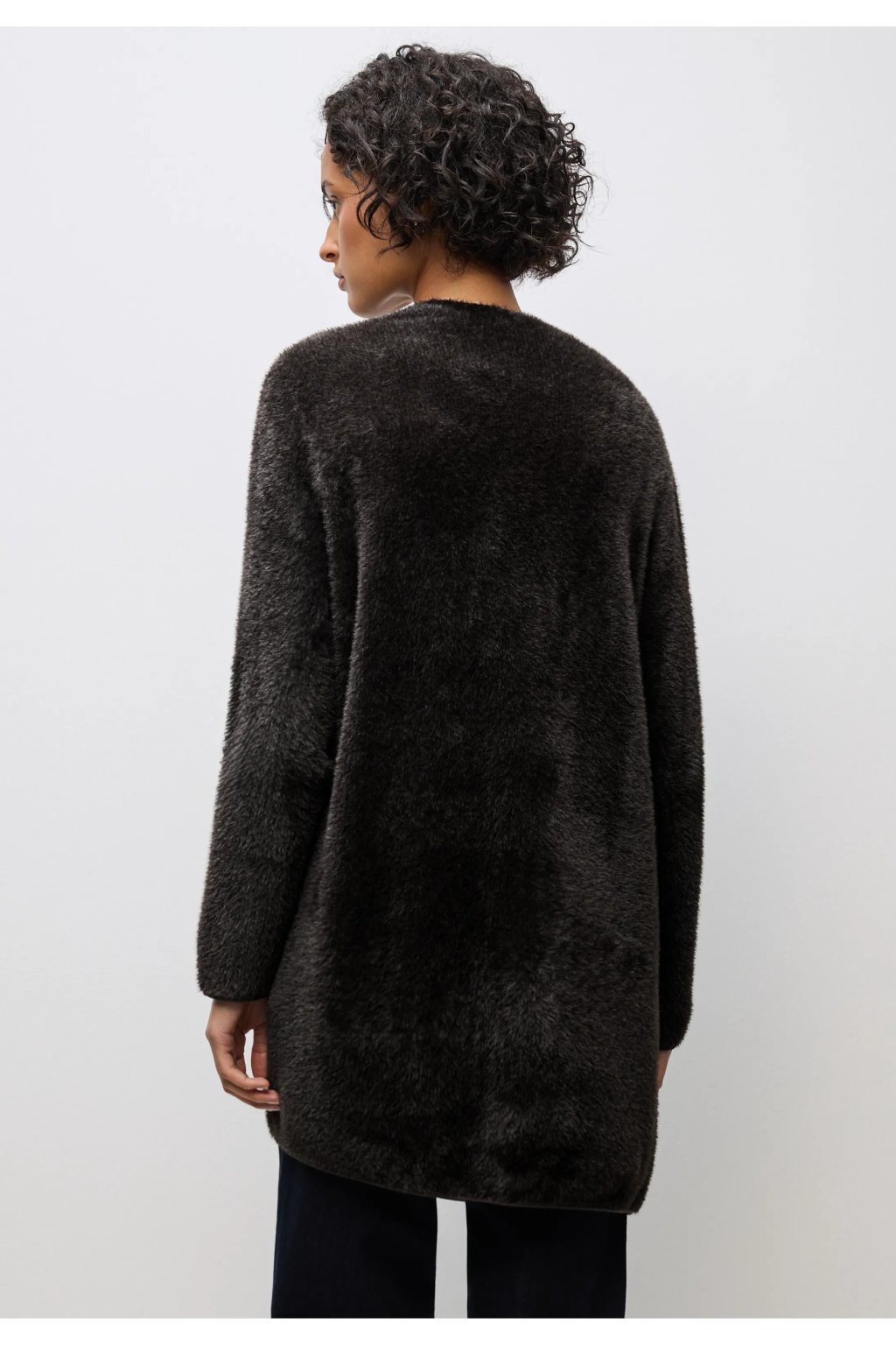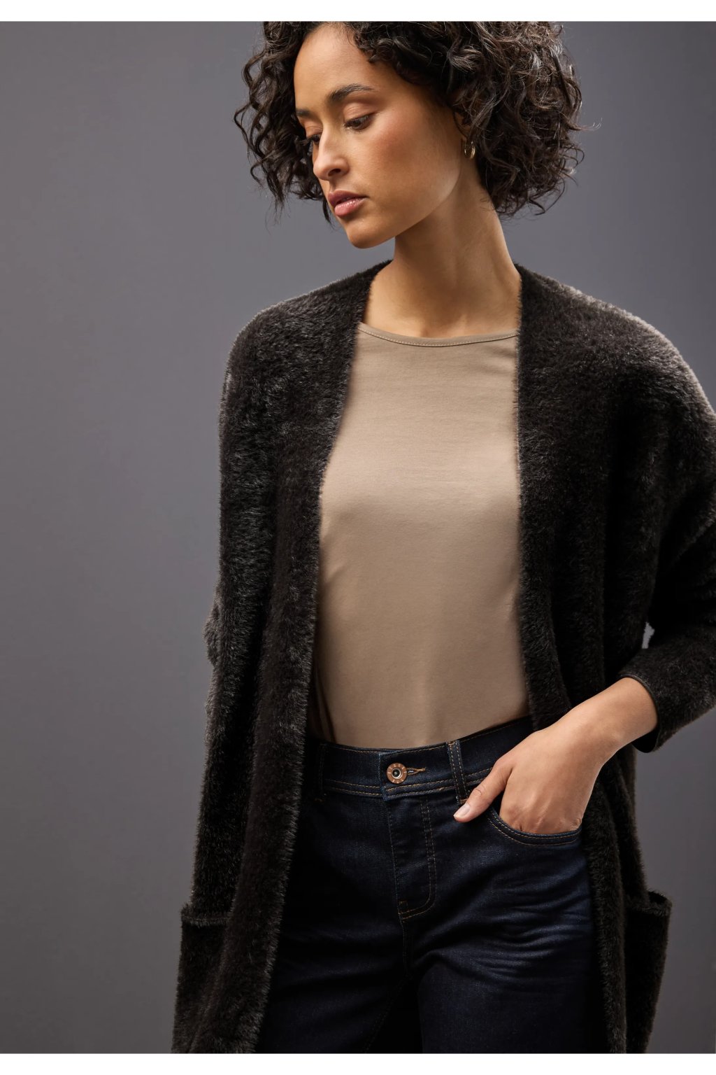 Tento dlhý kardigan od Street One pre ženy zaujme svojou mäkkou páperovou priadzou a uvoľneným vzhľadom. Je navrhnutý na nosenie v otvorenom stave a má nakladané vrecká, takže je ideálny pre útulné vrstvené outfity. Jeho plyšová textúra z neho robí perfektný kúsok pre chladnejšie dni.