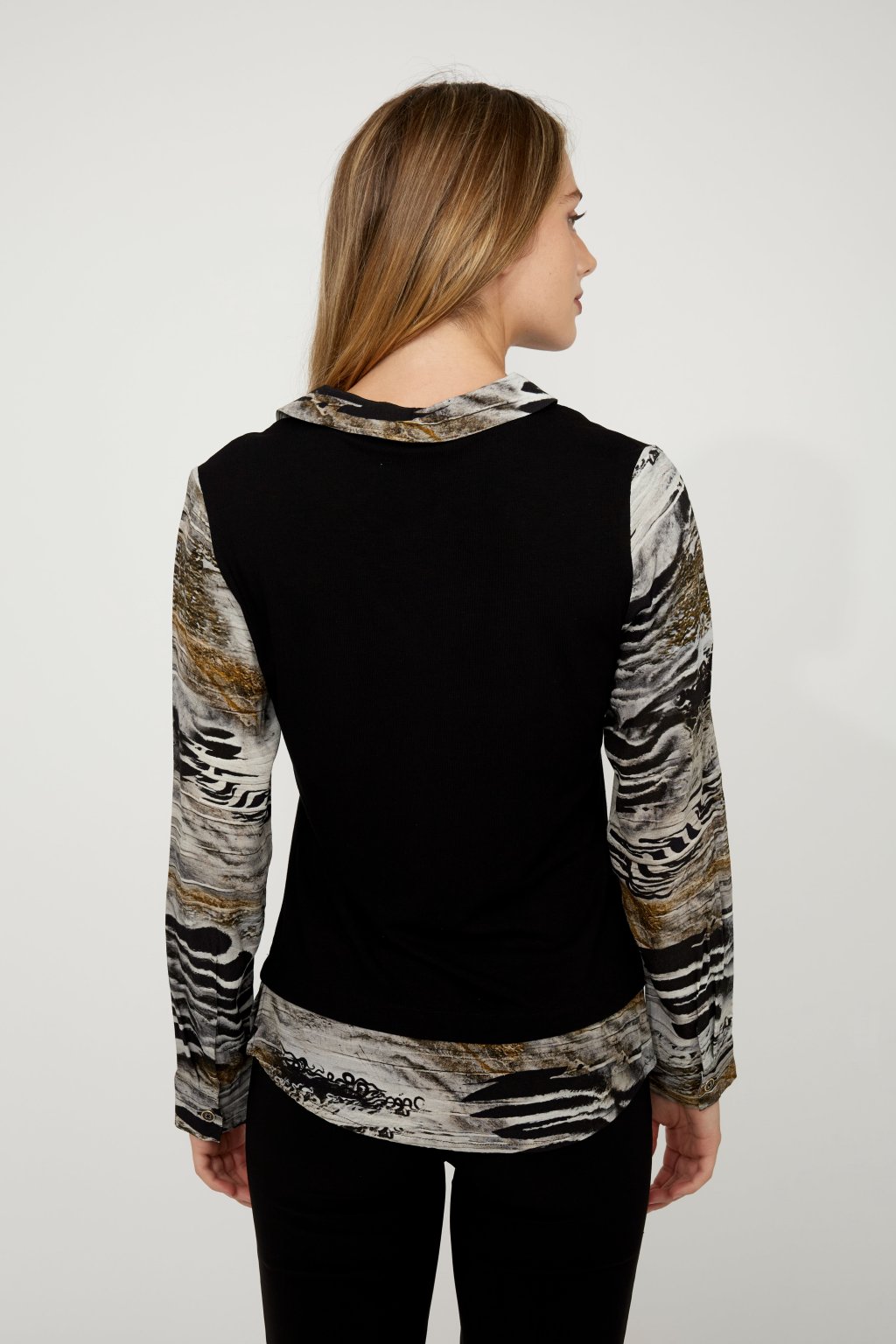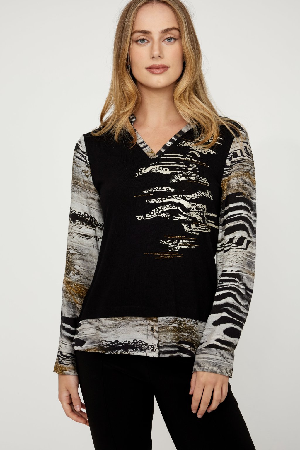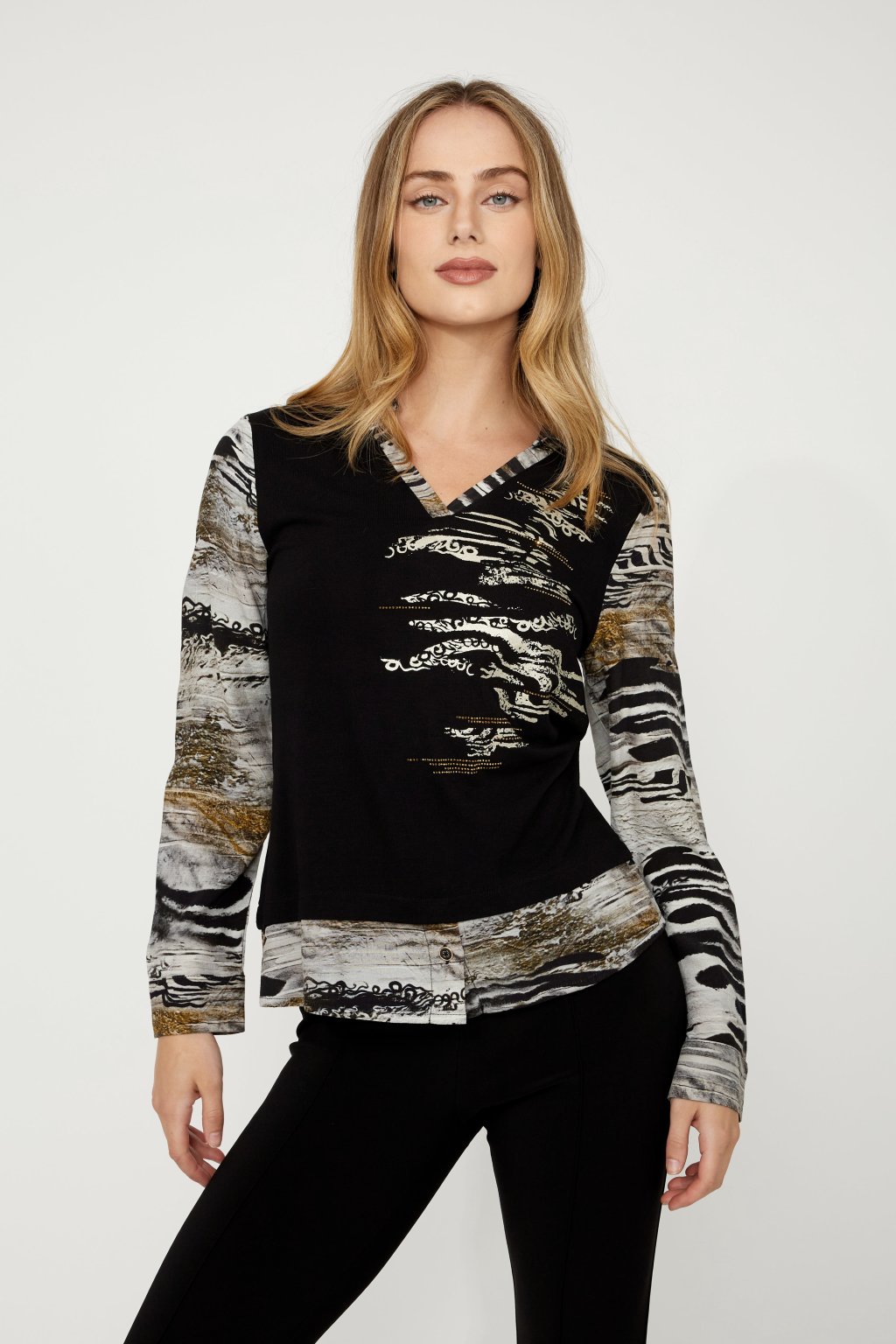 Dámska blúzka Dolcezza spája ležérnu eleganciu s jemným nádychom sofistikovanosti. Priliehavý strih v dĺžke do bokov dopĺňa výstrih do V zdobený jemnými kamienkami, ktorý sa hodí ako do kancelárie, tak na voľný čas. Originálna kombinácia abstraktného a zvieracieho vzoru dodáva modelu jedinečný vzhľad, zatiaľ čo dlhé rovné rukávy zaisťujú maximálne pohodlie. Štýlový kúsok, ktorý sa stane univerzálnou súčasťou vášho šatníka.