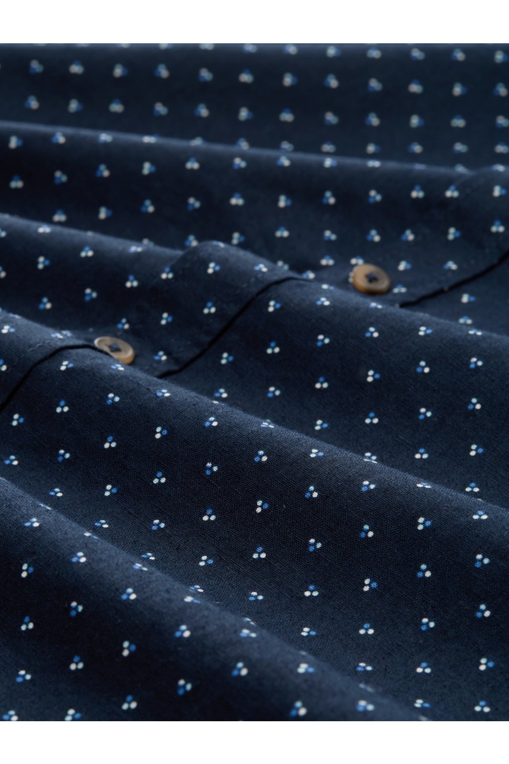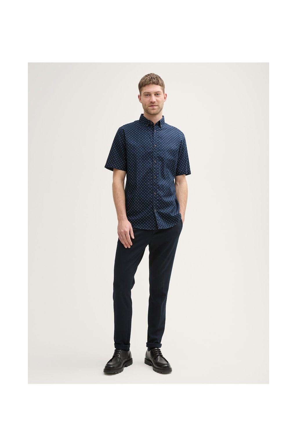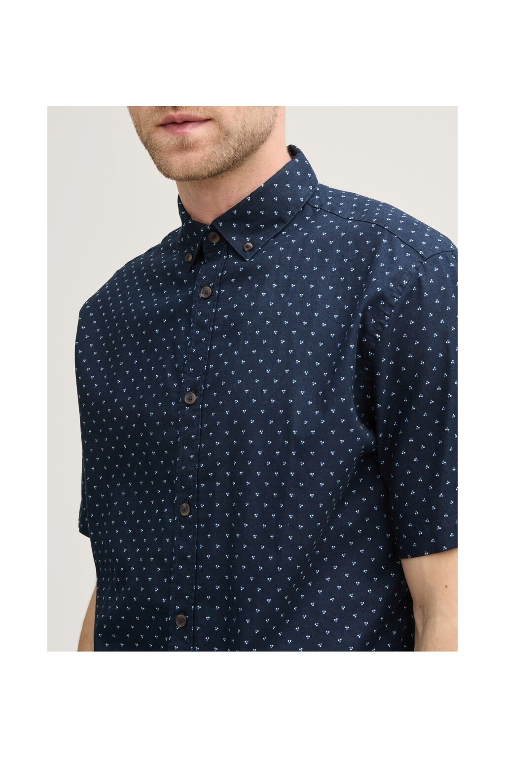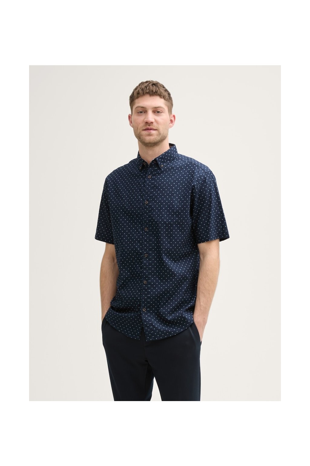 Pánska košeľa s krátkym rukávom - ležérna elegancia s bodkou. Štýlová košeľa s krátkym rukávom a button-down golierom je ideálnou voľbou pre neformálne aj ľahko elegantné príležitosti. Bodkovaný vzor dodáva košeľu svieži vzhľad, zatiaľ čo regular fit strih zaisťuje pohodlné nosenie. Bez vreciek, zato s praktickým légom na gombíky, ktoré podčiarkuje čistý a uhladený dojem. Perfektný k džínsom aj chinos nohaviciam.