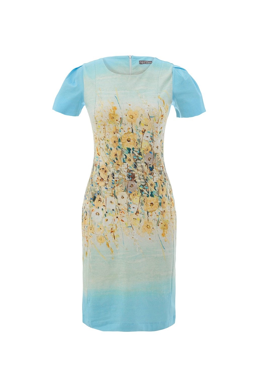 Očarujúce dámske šaty Dolcezza zaujmú na prvý pohľad originálnym kvetinovým motívom v jemných odtieňoch modrej a žltej. Priliehavý strih krásne zvýrazní siluetu, zatiaľ čo príjemný, pružný materiál zaistí pohodlie po celý deň. Krátke rukávy a elegantná dĺžka dodávajú modelu ženský a sofistikovaný vzhľad. Ideálna voľba pre spoločenské príležitosti, letné akcie aj štýlové denné nosenie - stačí doplniť podpätky alebo sandále a outfit je dokonalý.